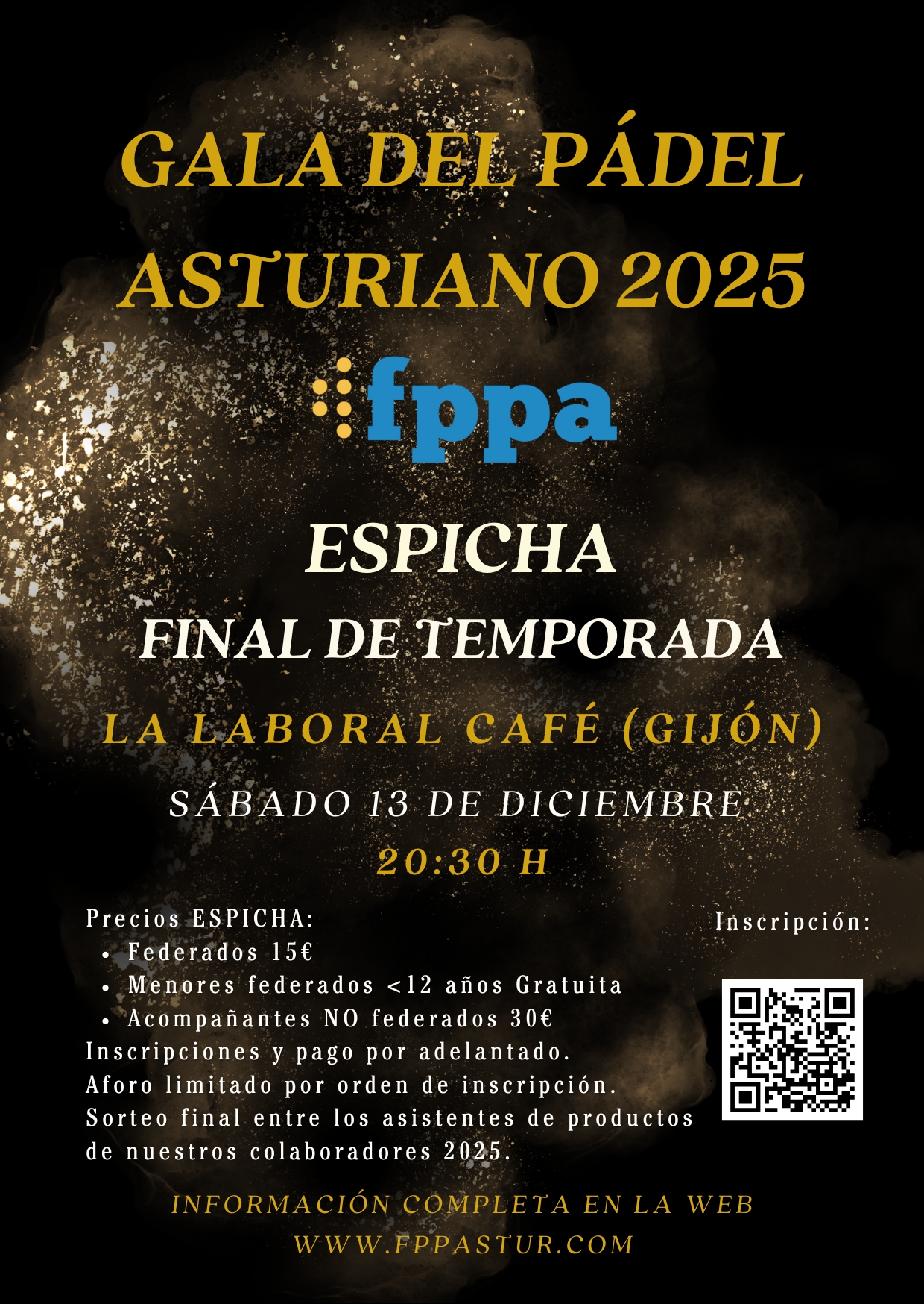 La Gala del Pádel Asturiano 2025 se iniciará a las 20:30h en La Laboral Café (Universidad Laboral de Gijón) con un acto de entrega de trofeos el que se premiarán a los campeones y finalistas de la temporada 2025: